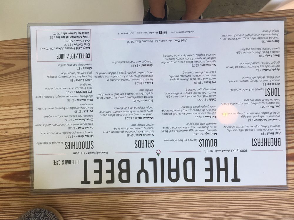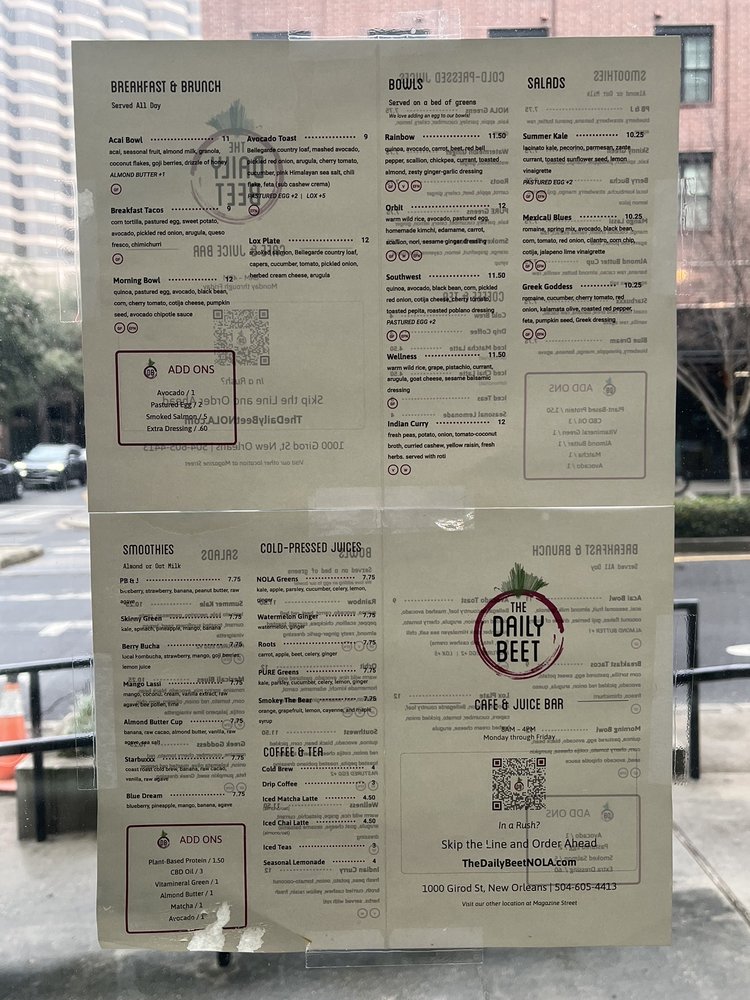 The Daily Beet is a vegetarian haven located on 1000 Girod St in New Orleans, LA. This trendy and casual spot offers a variety of fresh and healthy options for breakfast, brunch, and lunch. With a menu filled with vegan options, their dishes are not only delicious but also environmentally conscious with plastic-free packaging, compostable containers, and reusable tableware. Customers rave about the flavorful salads, hearty bowls, and sweet treats like the almond butter chocolate chip energy bites and dragon fruit chia seed pudding. The friendly staff is always ready to provide recommendations and accommodate dietary restrictions. The inviting ambiance with outdoor seating and free Wi-Fi makes it the perfect spot to enjoy a meal or catch up on work. Whether you're a health-conscious eater or just looking for a tasty vegetarian meal, The Daily Beet is sure to impress with its fresh and flavorful offerings.