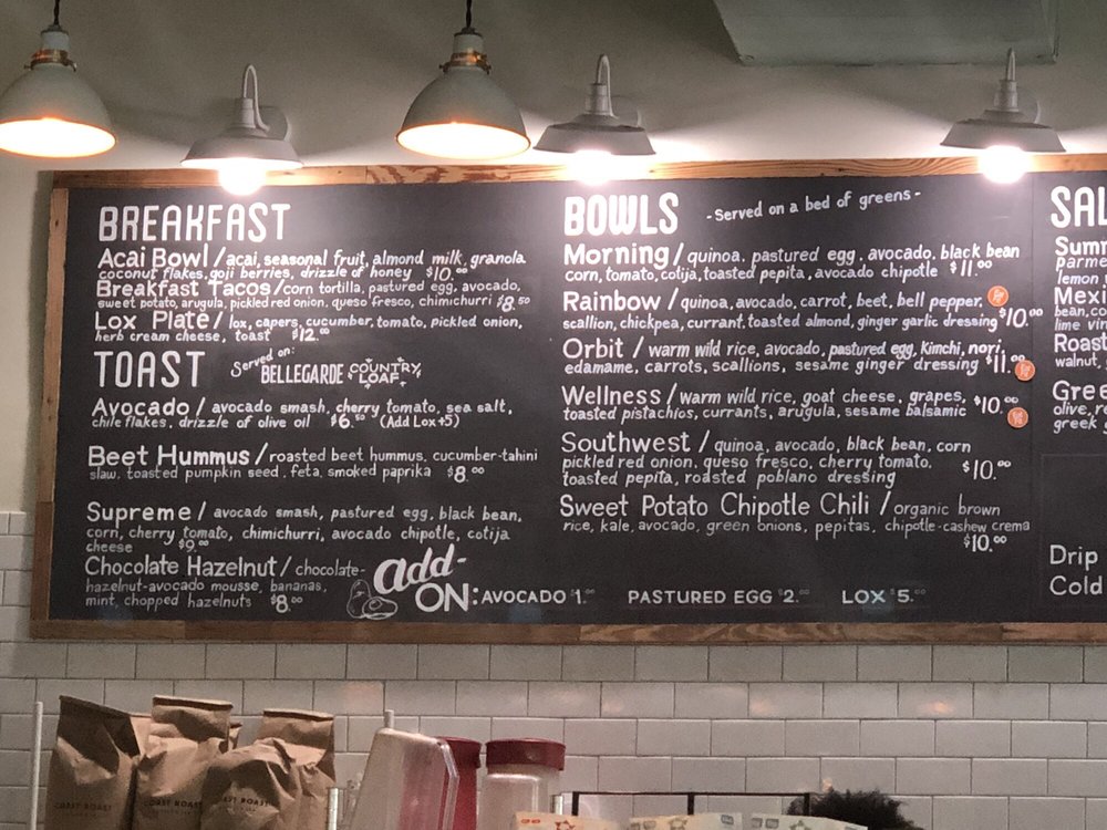 Acai, seasonal fruit, almond milk, granola, coconut flakes, goji berries, and a drizzle of honey.